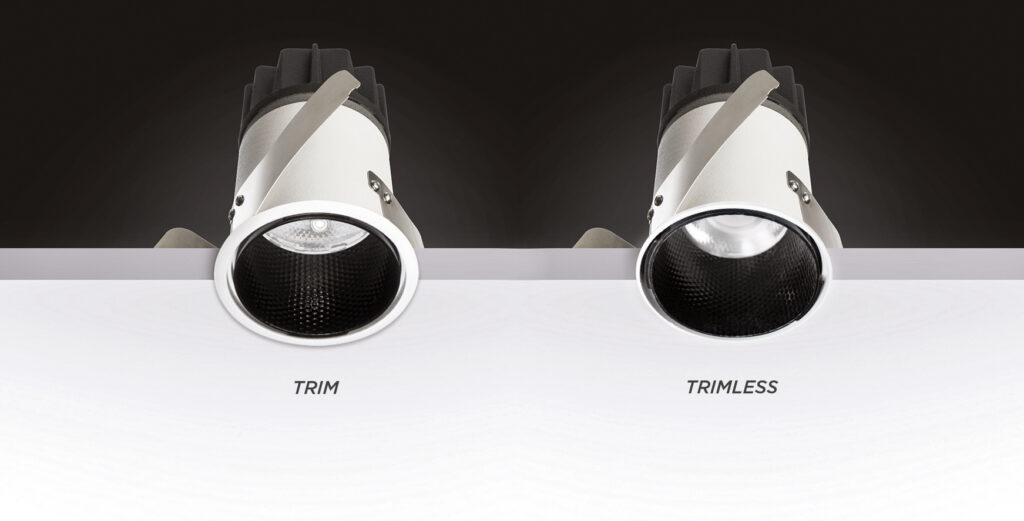 Famiglia di faretti fissi trim e trimless per illuminazione professionale da incasso, studiata per ottenere la massima prestazione nella minima dimensione,