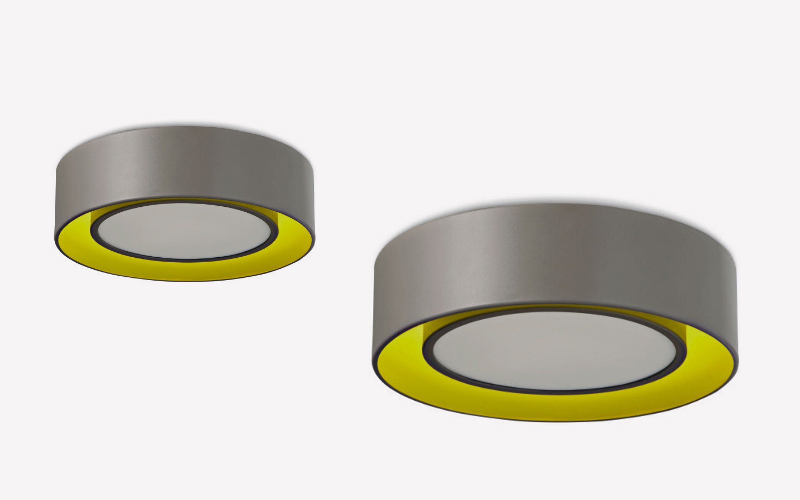 Deckenleuchte mit zwei SMD-LED-Leuchtmitteln. Das Hauptleuchtmittel wird von einer Halterung aus gebogenem Aluminium getragen und liegt hinter der opalen Diffusorabdeckung aus Methacrylat. Gleichstromversorgung mit Konstantstrom über den in die Leuchte integrierten Treiber Das zweite Leuchtmittel befindet sich in einem größeren Kreis aus gebogenem Aluminium. Gleichstrom-Stromversorgung mit Konstantspannung über den in die Leuchte integrierten Treiber Die zweite Lichtquelle hat eine rein ästhetische Funktion. Flüssiglackbeschichtung. Zwei Einschaltmodi. Kann mit einem separat zu bestellenden Zubehör auch aufgehängt werden.
