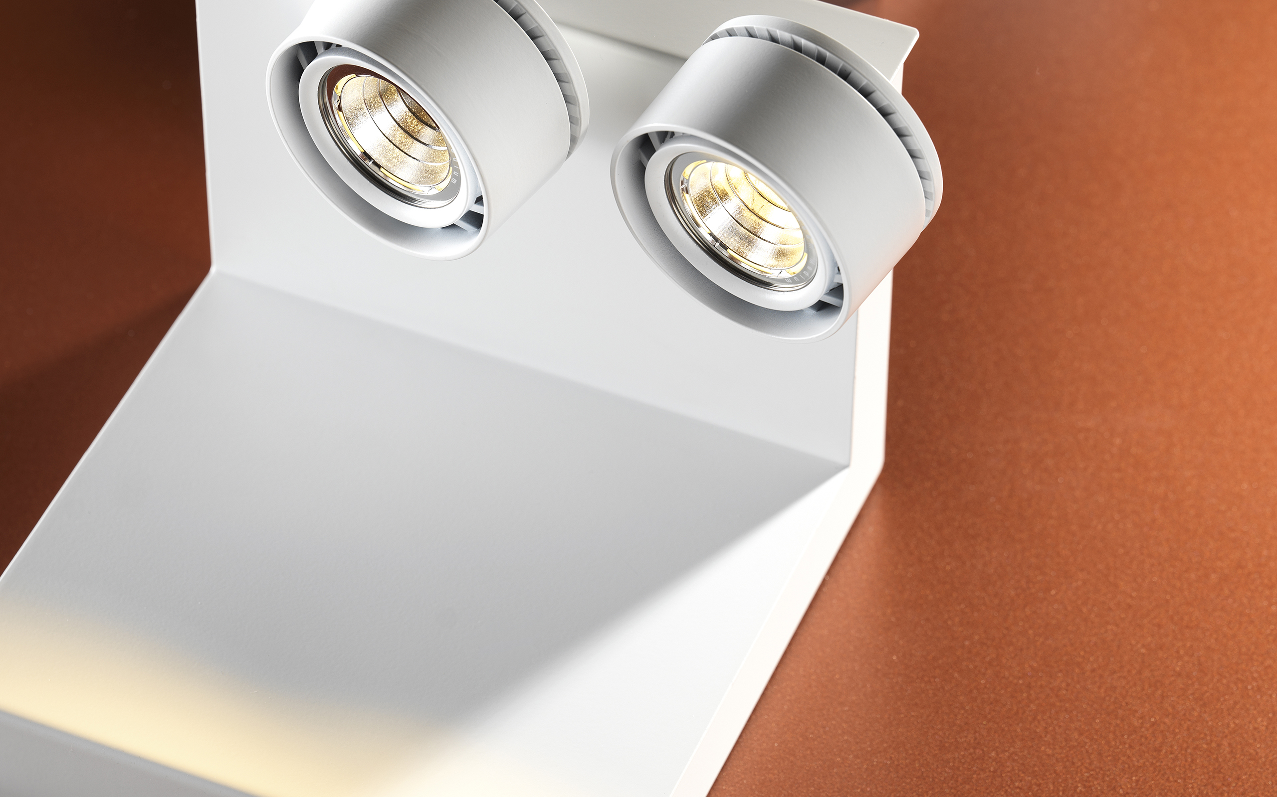 Wandleuchte mit COB (Chip on board). Stromversorgung über den in das Leuchtengehäuse integrierten Konstantstrom-Treiber. Die Leuchtmittel sind auf einer Aluminiumplatte montiert, wodurch eine korrekte Wärmeabführung garantiert ist. Die Leuchtmittel für die direkte Lichtkomponente sind auf zwei Optiken montiert, die auf horizontaler Ebene um 359° und auf vertikaler Ebene um +90°/-90° geschwenkt werden können. Reflektierende Optik aus lackiertem Polycarbonat mit Metallbeschichtung (separat zu bestellen). Verfügbare Abstrahlwinkel: Spot, Medium, Large, Extra Large. Leuchtengehäuse aus gebogenem Blech mit Flüssigkeitlackbeschichtung.
