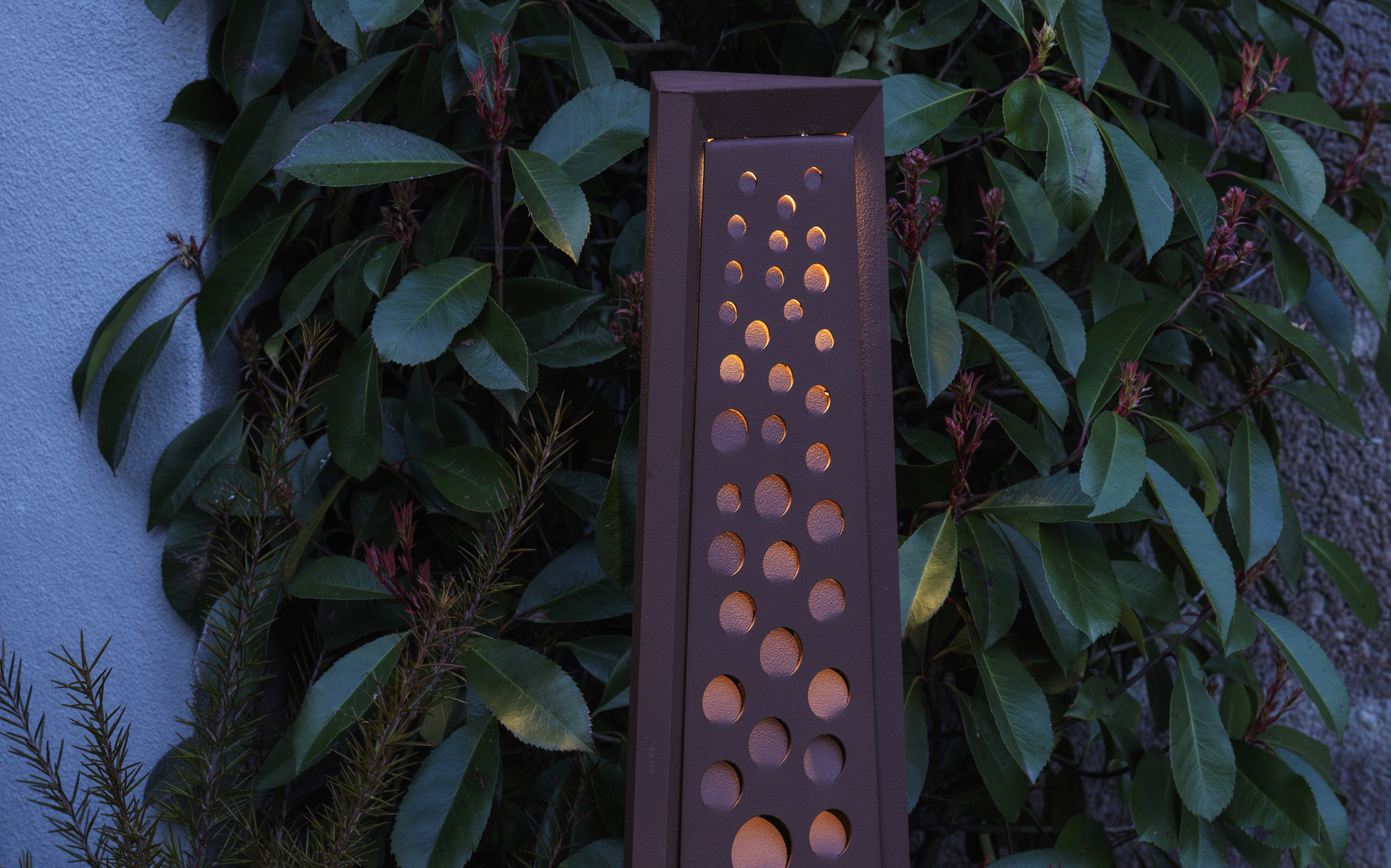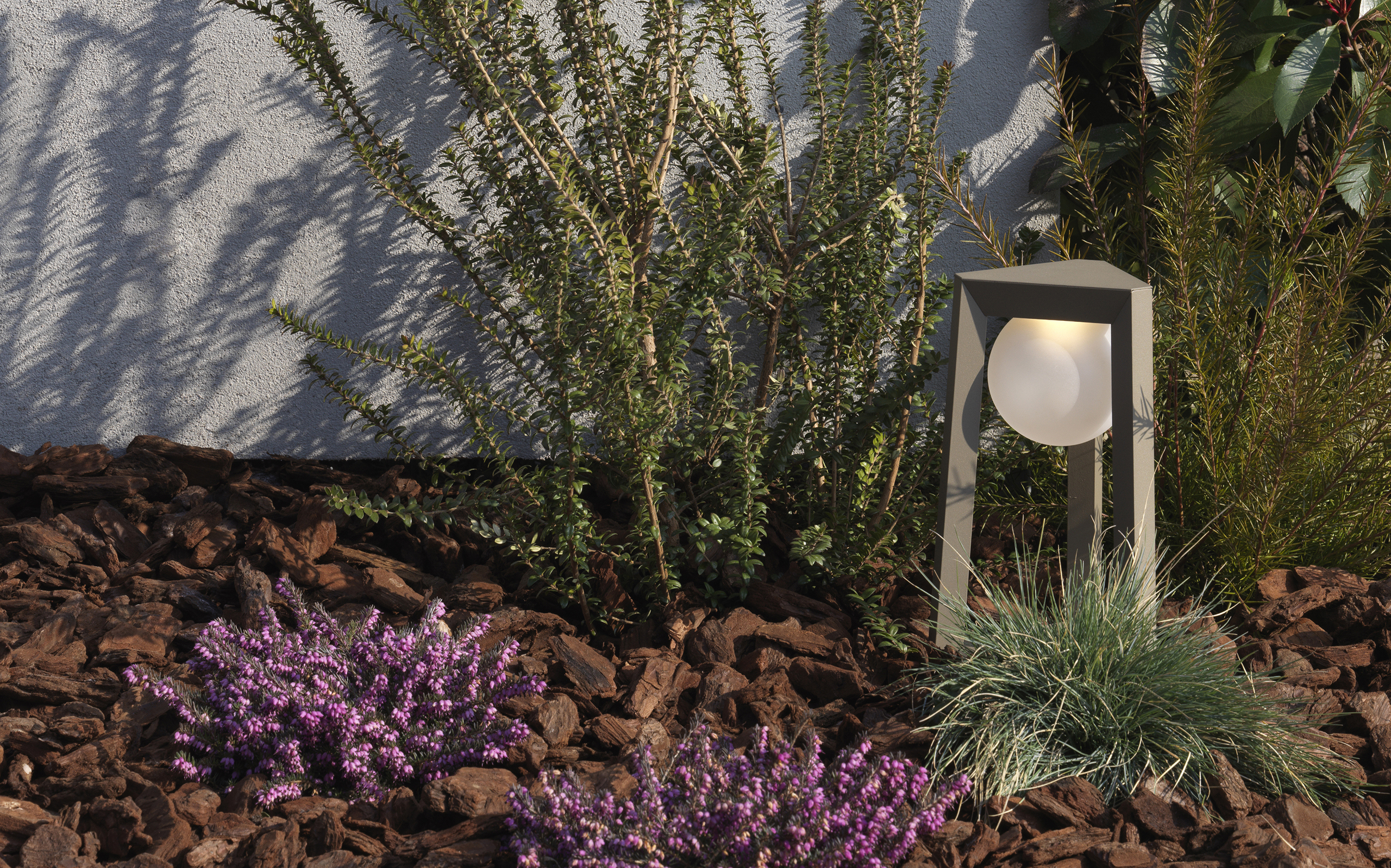 Pollerleuchte mit dreieckiger Struktur, Höhe 300/600/800 mm für die Installation am Boden oder an der Wand, ausgestattet mit LED-Platine und wasserfestem Diffusor, Abstrahlwinkel 120°. Für eine Lichtverteilung in alle Richtungen auch mit einem kugelförmigen Schirm aus PMMA erhältlich. Robuste Konstruktion aus Aluminium und Stahl mit stark haftender Pulverbeschichtung. Die Struktur wurde so entwickelt, dass sie robust und leicht ist und sich einfach und harmonisch in das Ambiente integriert. Die bereits vorinstallierte Kugel verleiht der Leuchte nachts ihr Profil und verwandelt sie von einer gut getarnten Lichtquelle in ein leuchtendes und präsentes Signallicht. Die CV-Versionen sind mit 4,5 W (450 lm) oder 8 W (750 lm) bei einem CRI 85 erhältlich, während die AC-Versionen mit 6 W (550 lm) oder 9 W (1020 lm) bei einem CRI95 verfügbar sind. Farbtemperaturen 2700 K, 3000 K oder 4000 K. Lebensdauer 45.000 Stunden bei L80 B10. Die Pulverbeschichtung ist in natürlichen und texturierten Farben, wie Carbongrau, Fangobraun, Mattsand, Warmweiß und Rost-Effekt erhältlich. Schutzart IP66. Alternativ zum Kugelschirm ist ein abschirmender Zubehörartikel verfügbar, der die Emission unterteilt und die Ästhetik des Produkts verändert, wodurch es zu einem sehr dekorativen und atmosphärischen Element wird. Es ist möglich, bis zu drei Abdeckungen pro Gerät zu verwenden. Nach EN 62471:2008 eingestuft als geringes Risiko für die fotobiologische Sicherheit von Beleuchtungsanlagen (RG1). Auf Anfrage ist die Zusatzbehandlung CRC erhältlich, die für Umgebungen mit Extrembedingungen empfohlen wird.