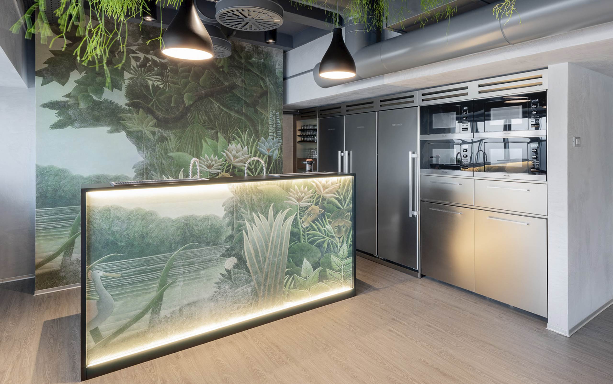 Die Räumlichkeiten der Mitarbeiter Kantine, mit einer Fläche von etwa 300 Quadratmetern, umfassen einen Lounge-Bereich, einen Schulungsraum, die Kantine und einen Außenbereich.