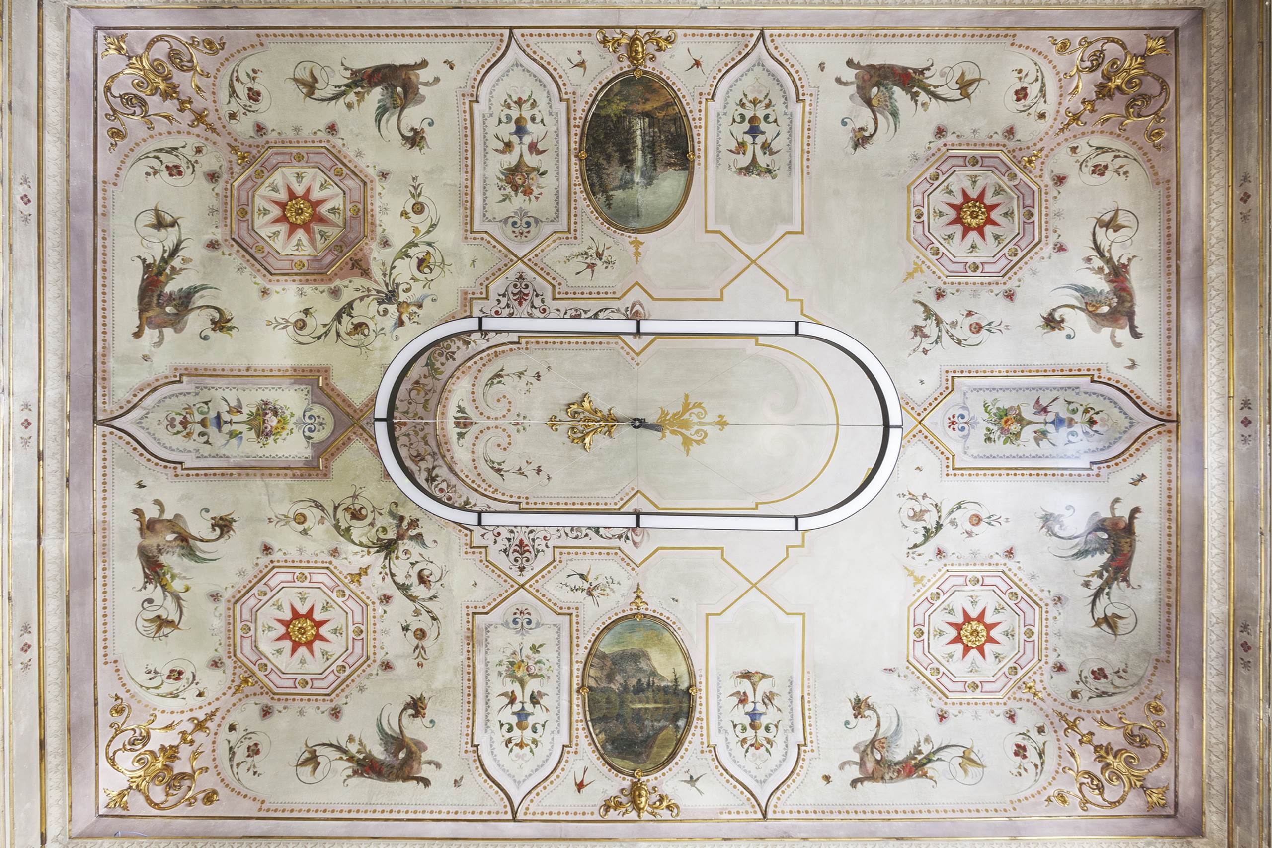 Diese Leuchten bieten komfortables, diffuses Licht und sehen mit ihrem sauberen, luftigen Design aus. In den Fresbeamten gibt das Design dieser Leuchten die dekorativen Kompositionen an den Decken wieder. An anderer Stelle wurde die Entscheidung getroffen, minimale, kreisförmige oder rechteckige Formen zu verwenden. Alle hängenden Leuchten sind sowohl direkte als auch indirekte Beleuchtungsfähigkeiten ausgestattet und bieten Lux -Werte, die zum Aufschluss von Schreibtischen und Tischen geeignet sind, und betonen gleichzeitig die Gewölbedecke.