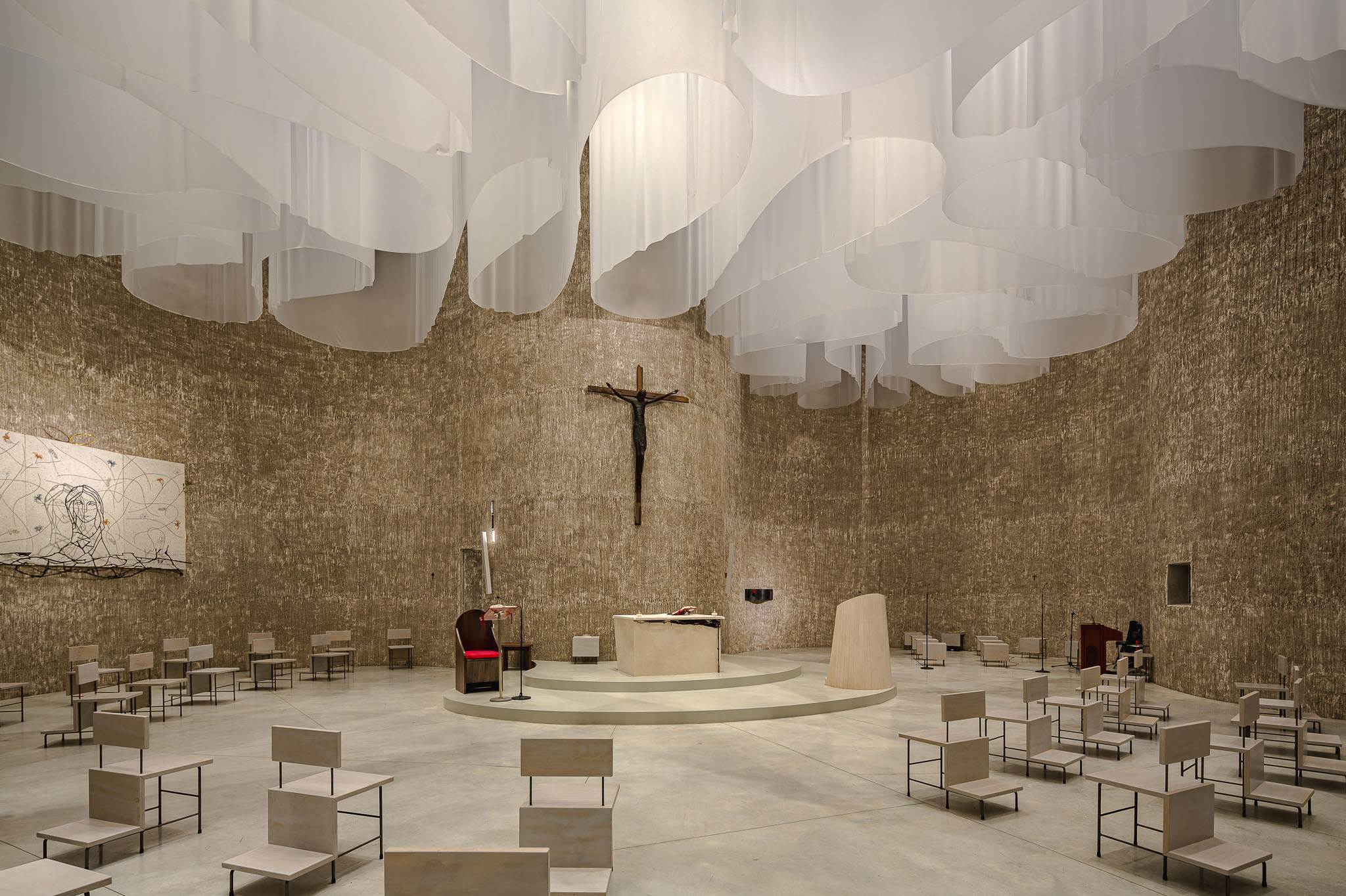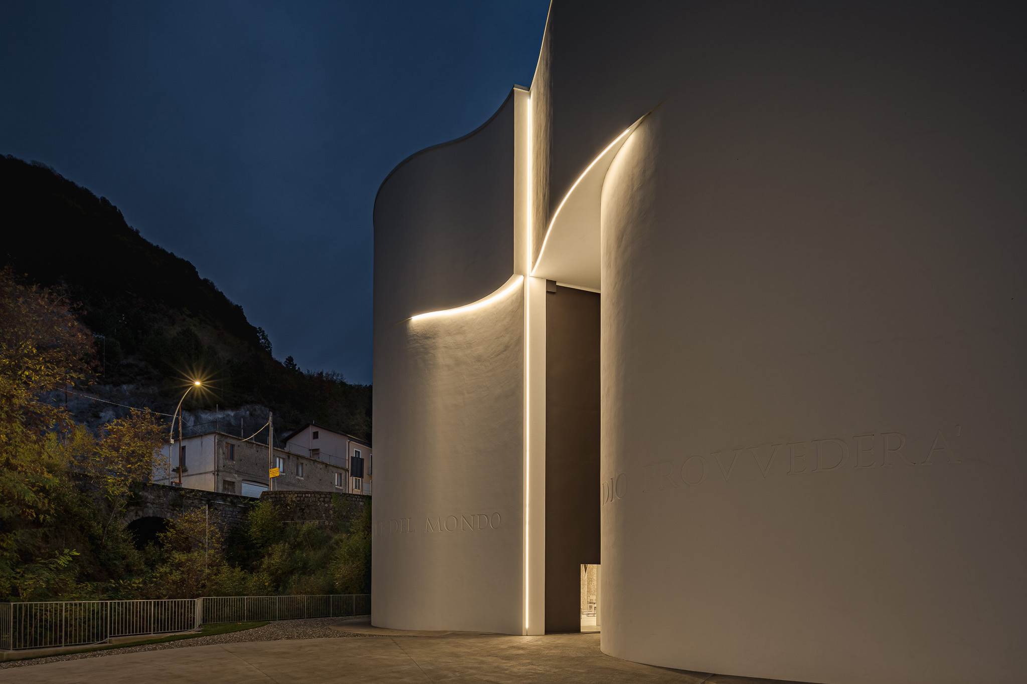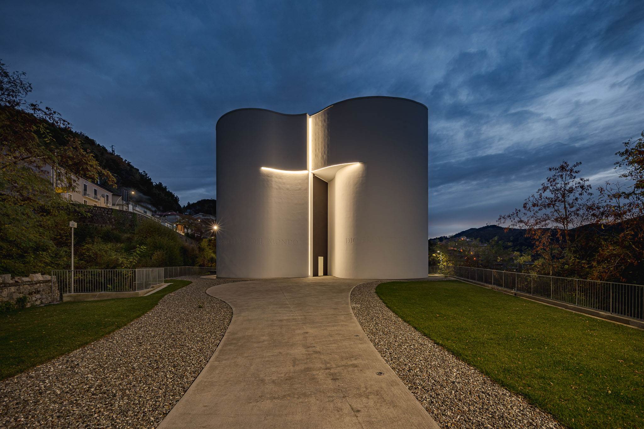 A singular project that interprets the sacred theme with a very powerful and decisive monumentality, where the stylistic logic, more than anywhere else, is revealed inside in all its intensity. The monolithic dimension of the exterior evaporates into the interior space where the metaphysical essence is captured by a dynamic and restless sky made of light and the movement of clouds. An ethereal scenario where light determines the intensity of the atmosphere, mixes, chases itself, diluting itself between natural and artificial in a continuous peaceful transformation. A lighting project with a high emotional content built with soft beams and high-precision optics where the scenic and functional result marry and calibrate the intensity of the sacred hall itself.