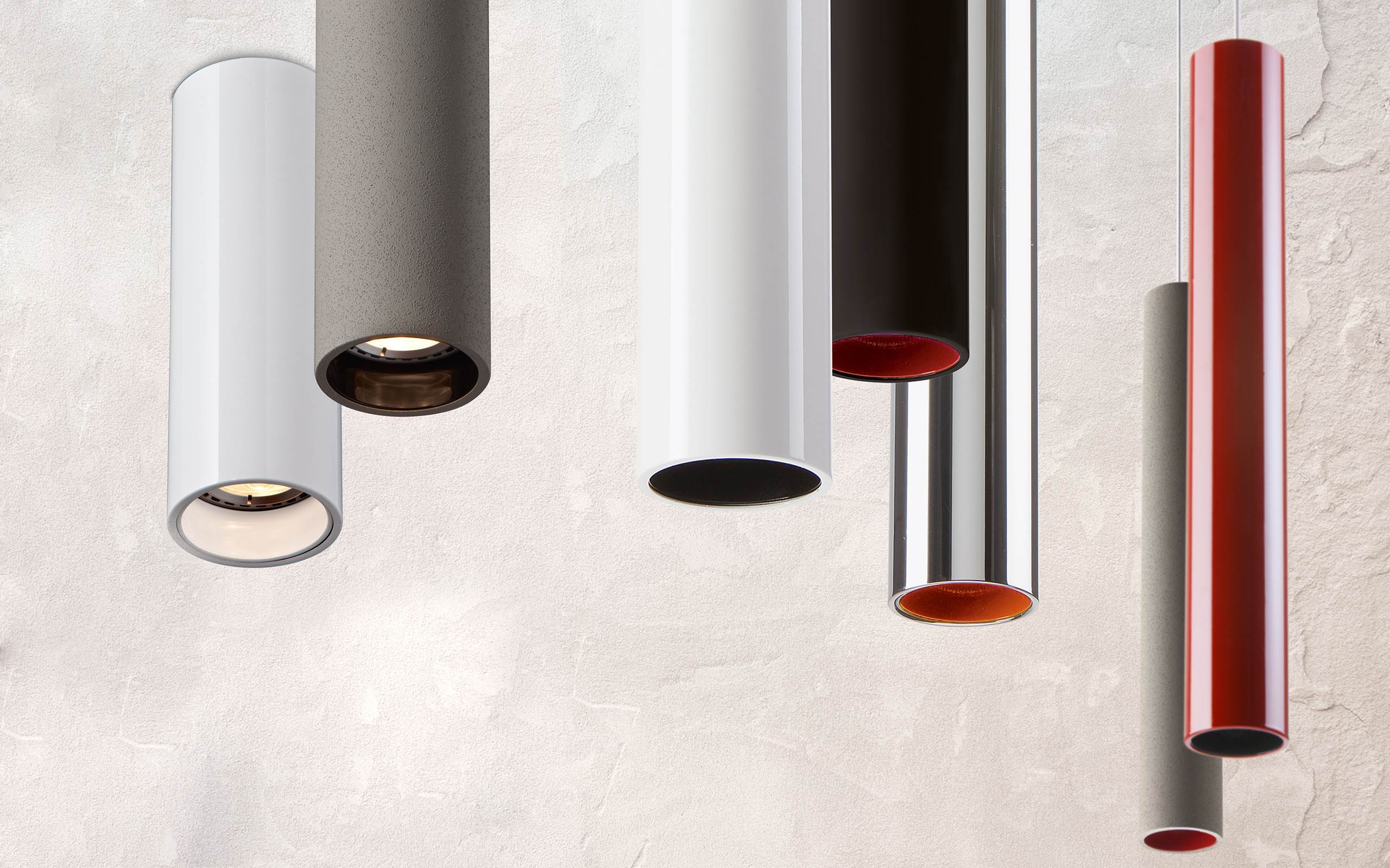 Luminaria de suspensión para fuente lumínica LED. Cuerpo y rosetón de aluminio cromado o esmaltado en distintos tonos de color. Cada aparato se suministra con anillos decorativos interiores de color rojo laca y negro opaco. Fuente de alimentación integrada 220/240V – 50/60Hz.