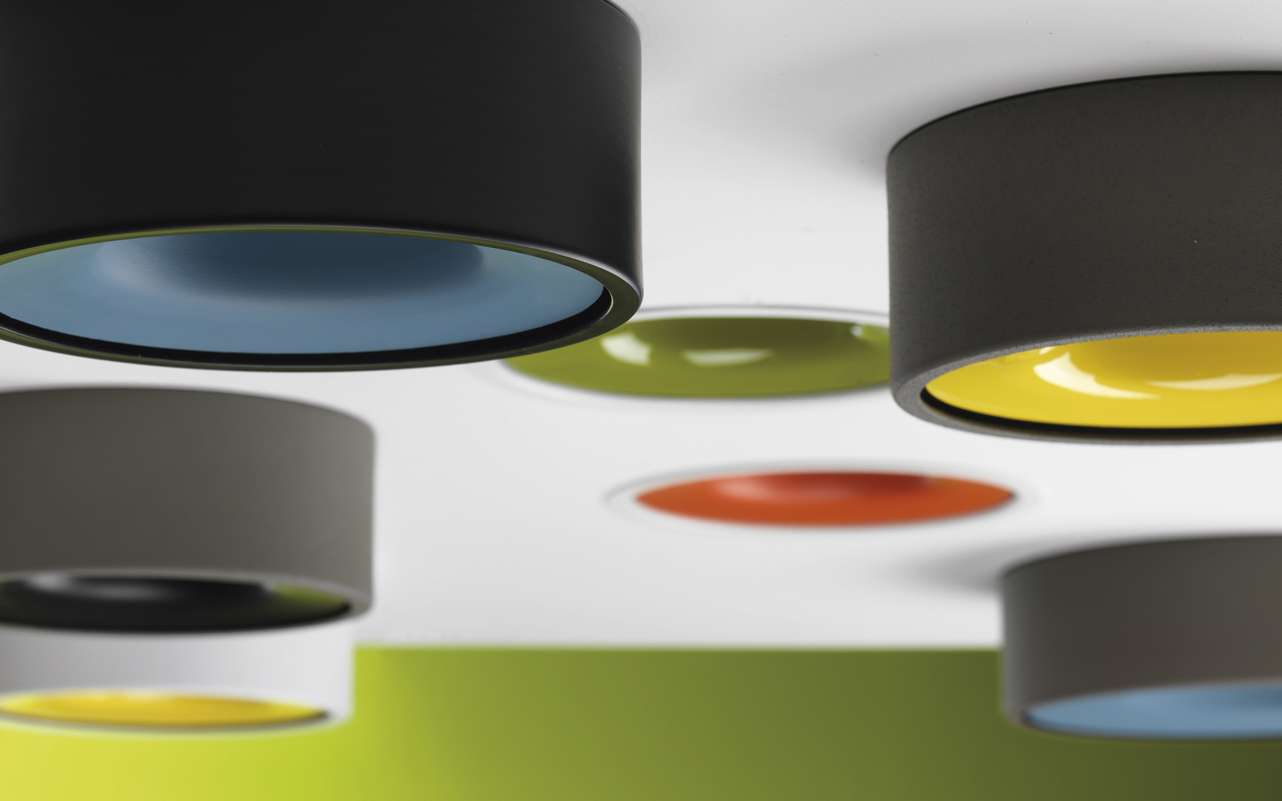 Luminaria de techo con fuente lumínica LED. Cuerpo de aluminio esmaltado en blanco opaco, negro opaco o gris cemento. Complétese con anillo. Fuente de alimentación integrada 220/240V – 50/60Hz. Para la versión Teddy Large, además del anillo clásico se encuentra también disponible el nuevo anillo versión Comfort.