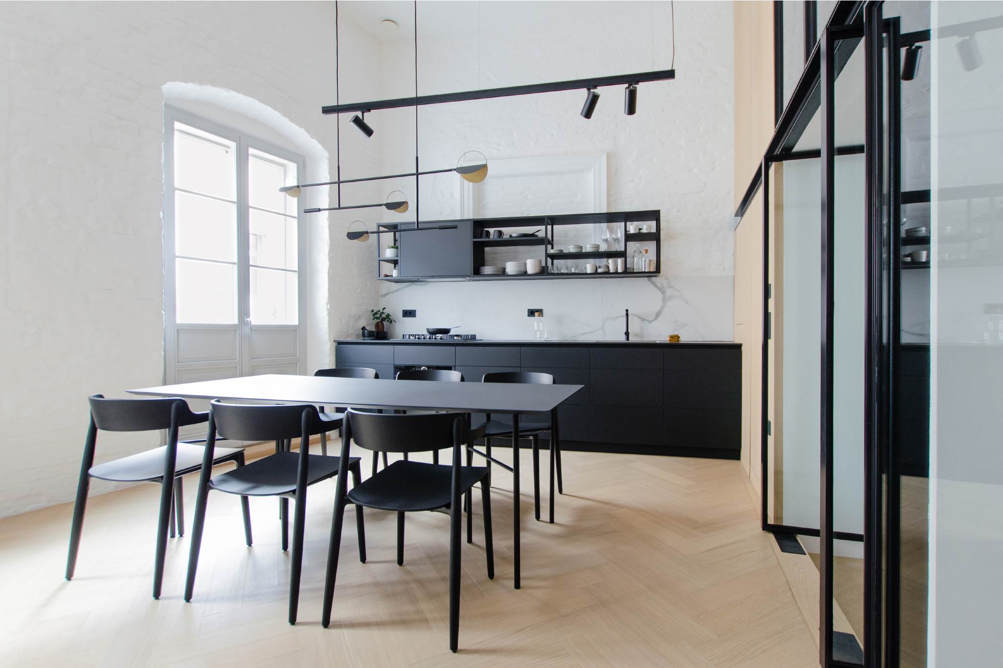 Aunque un enfoque tradicional habría sugerido colocar el dormitorio frente a una de las ventanas, limitando el espacio y la luz natural, elegimos optimizar el uso de las ventanas existentes y mover las demás habitaciones hacia el interior del apartamento. Las habitaciones están dispuestas en dos niveles, separados por una segunda fachada. El uso del vidrio y dos capas de cortinas permite equilibrar la privacidad y la luz natural, ofreciendo vistas a la calle principal y aprovechando al máximo la luz natural.