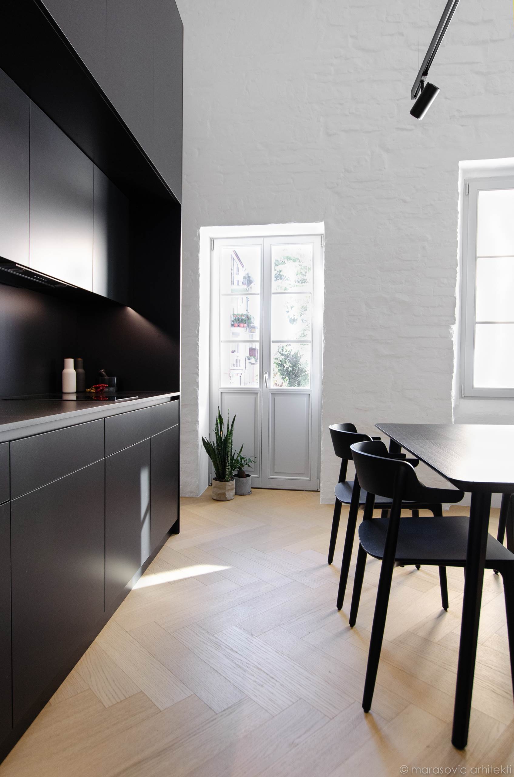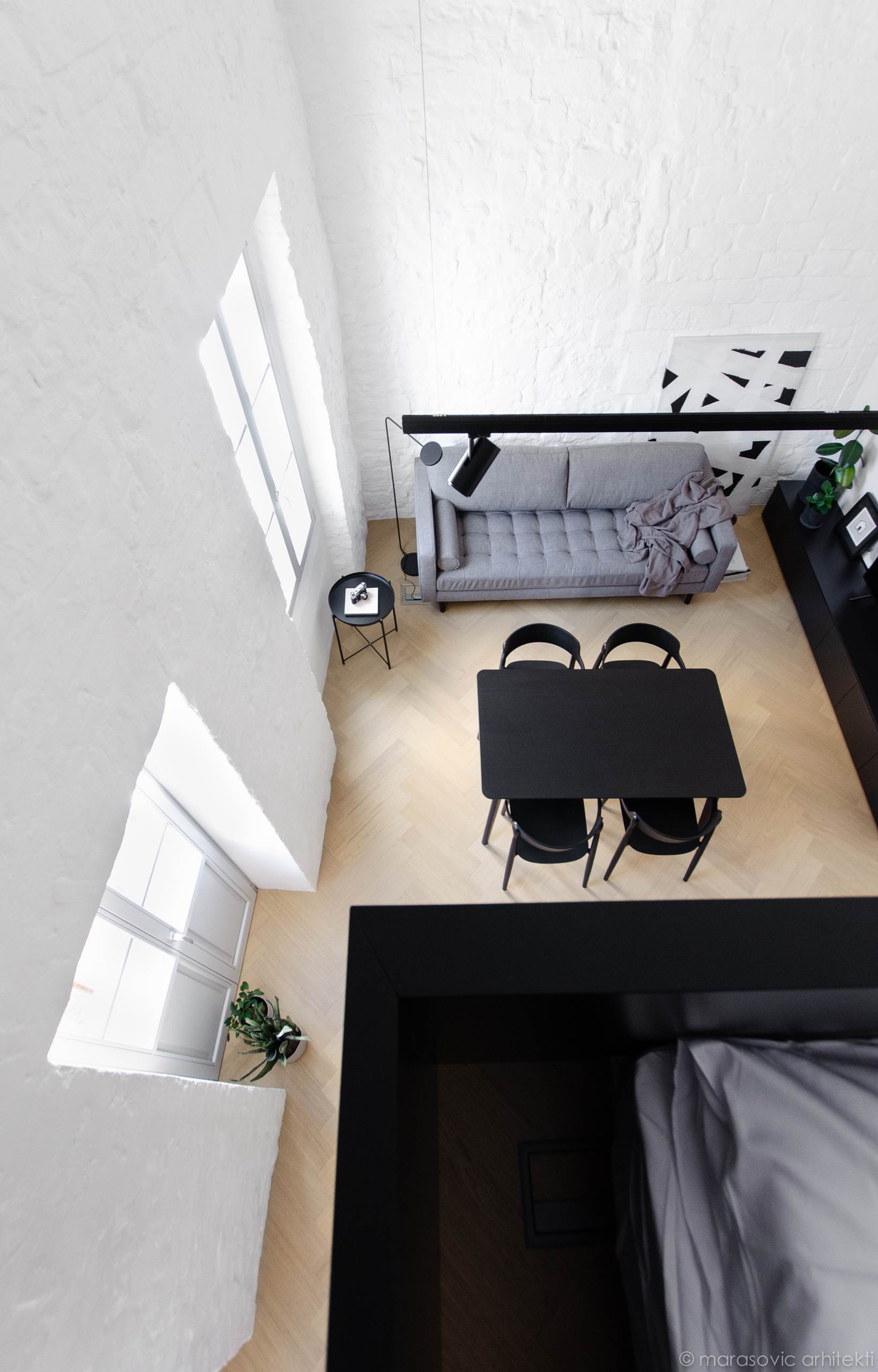 Este proyecto se trata de un pequeño estudio en el centro histórico de Koper, concebido bajo el principio de «una caja dentro de una caja». La nueva «caja negra» alberga todas las funciones principales del apartamento, distribuidas en dos niveles: la cocina y el baño están en el primer nivel, y el dormitorio en el segundo. La «caja blanca» representa el apartamento original, conservado en su forma original, con techos altos, paredes de piedra, ventanas y una puerta al balcón que reflejan la historia del edificio.