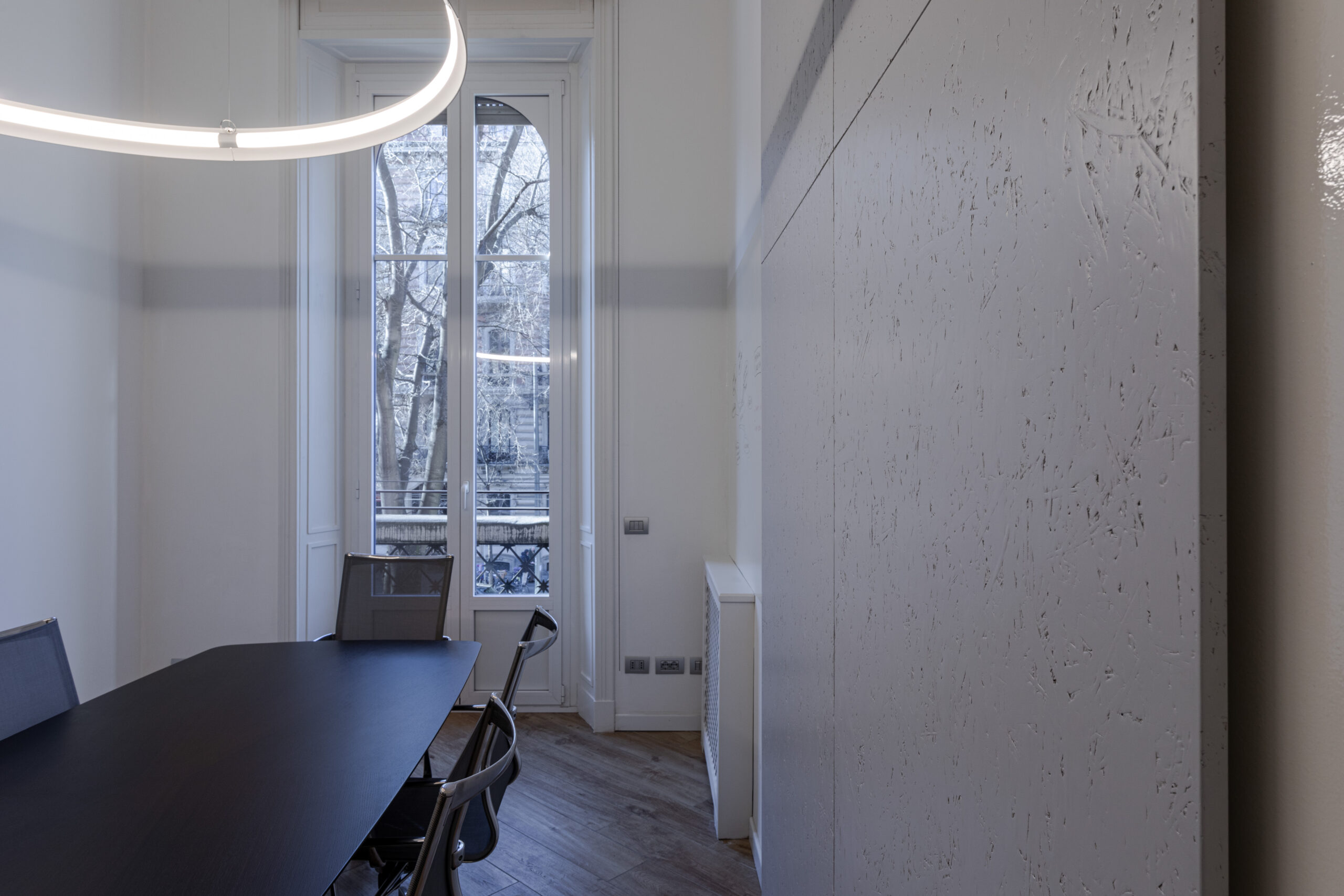 El diseño de la iluminación intentó reforzar y diversificar las características espaciales de los espacios, de modo que en los espacios abiertos se optó por una secuencia de cuerpos lineales (Led Runner) con acabado corten y acero blanco (para el vestíbulo), mientras que en las salas de reuniones se acentuó la centralidad de los espacios con suspensiones circulares de doble emisión (Hola y Naboo). Por último, en el salón, el carácter más informal se ha confiado a parejas de pequeñas lámparas de suspensión (IO) dirigidas a las dos mesas de acero.