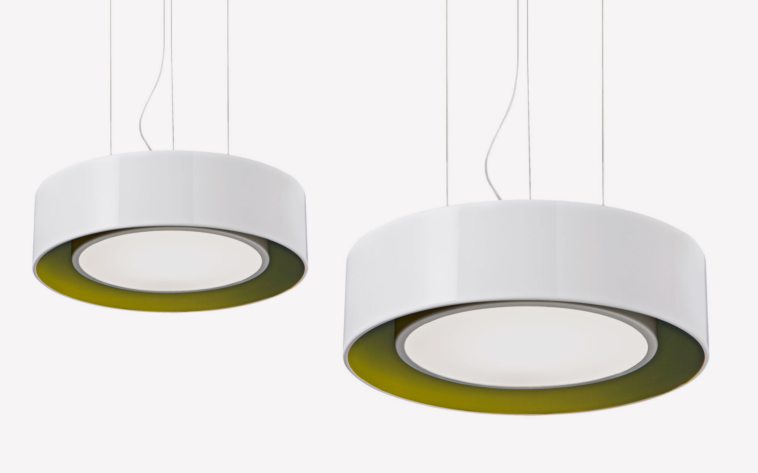 Apparecchio a sospensione con doppia sorgente LED SMD. La sorgente principale è installata all’interno di un supporto ottenuto mediante tiratura a lastra in alluminio e schermata da uno schermo opale diffondente in metacrilato. Alimentazione DC corrente costante tramite driver integrato a bordo dell’apparecchio. La sorgente secondaria, è anch’essa installata su un supporto ottenuto con lo stesso procedimento ma più grande. Alimentazione DC tensione costante tramite driver integrato a bordo dell’apparecchio. La sorgente secondaria ha uno scopo prettamente estetico. Verniciatura a liquido. Doppia accensione.