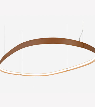 Apparecchio a sospensione con sorgente SMD lineare alimentata in corrente continua a tensione costante attraverso driver integrato nel corpo dell’apparecchio. Le sorgenti sono installate su una piastra di cablaggio bianca all’interno del prodotto, che ha inoltre la funzione di congiungere il profilo estruso calandrato esterno con quello interno che compongono il corpo dell’apparecchio. L’apparecchio completo è composto da sei settori connessi tra di loro tramite dei giunti di alluminio pressofuso, che assolvono anche il compito di sedi per il fissaggio dei cavi di sospensione d’acciaio dell’apparecchio. La connessione elettrica avviene su morsettiere situate dalla parte opposta al piano della piastra di cablaggio. Le morsettiere sono accessibili attraverso la rimozione di uno sportellino di accesso. Diffusore in PMMA opale, corpo apparecchio in lega di alluminio estrusa 6060. Regolazione micrometrica dell’altezza. Verniciatura a polveri in bianco opaco o nero opaco.