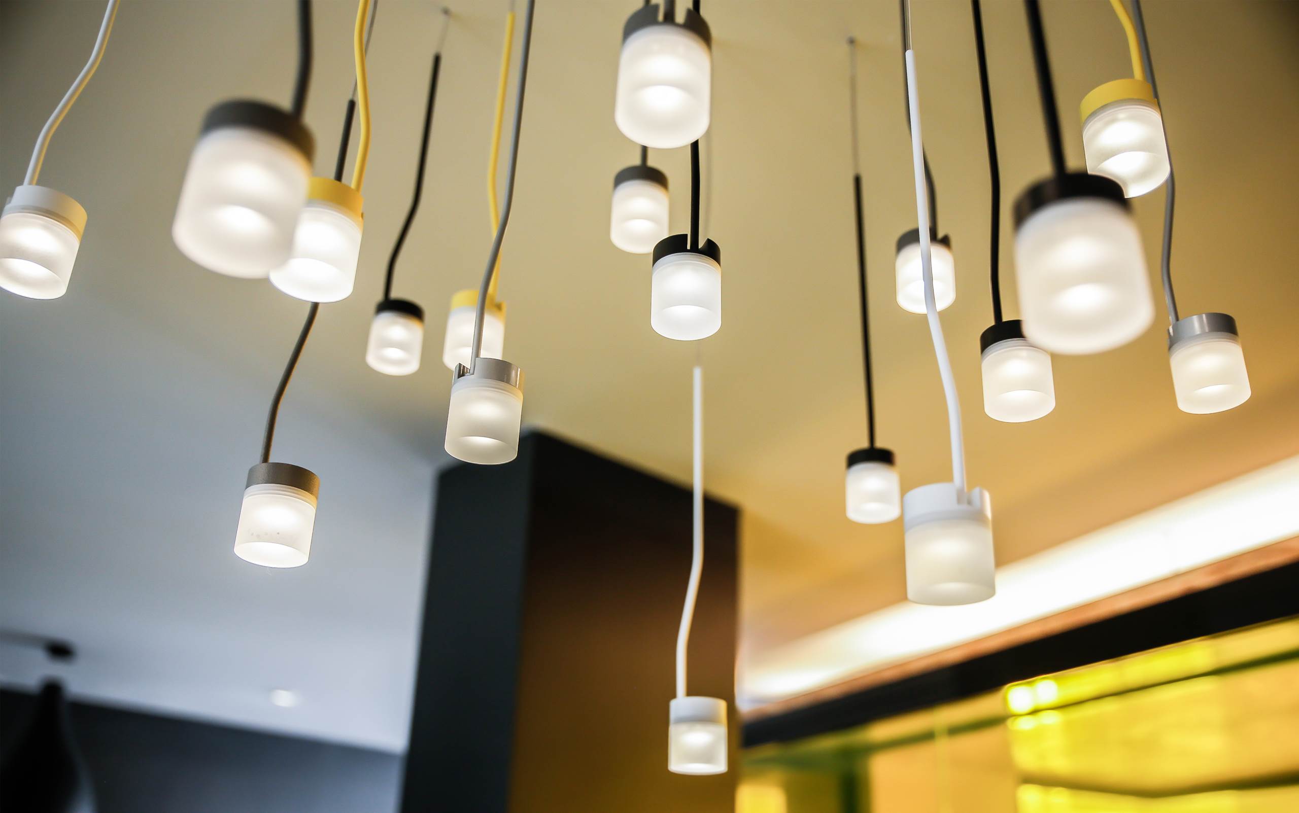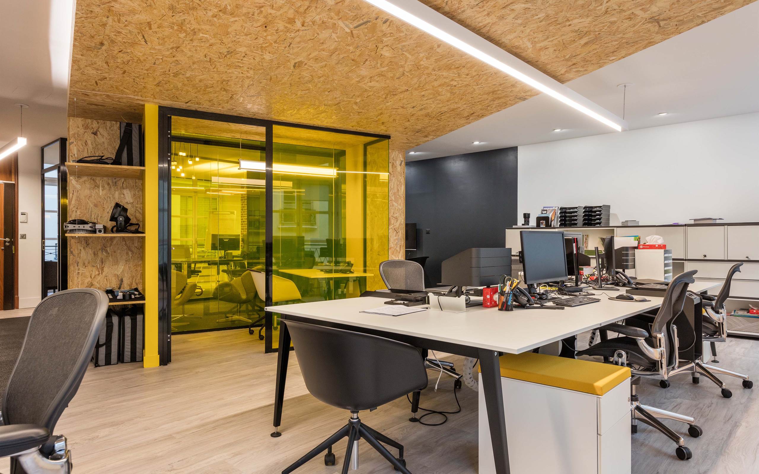 Una serie di apparecchi Exenia LIA illumina la cucina e la zona pranzo, mentre un Exenia WILLY è appeso sopra il tavolo della sala conferenze, affiancato da due Lumenalpha Clear Small Downlight. Gli apparecchi Lumencove si trovano in cima all’area principale dell’ufficio rivestita di compensato, dove un apparecchio Fluxwerx PROFILE sovrasta la scrivania centrale, mentre un sempre popolare Fluxwerx VIEW adorna lo spazio intermedio dell’ufficio con pareti in vetro ambrato.