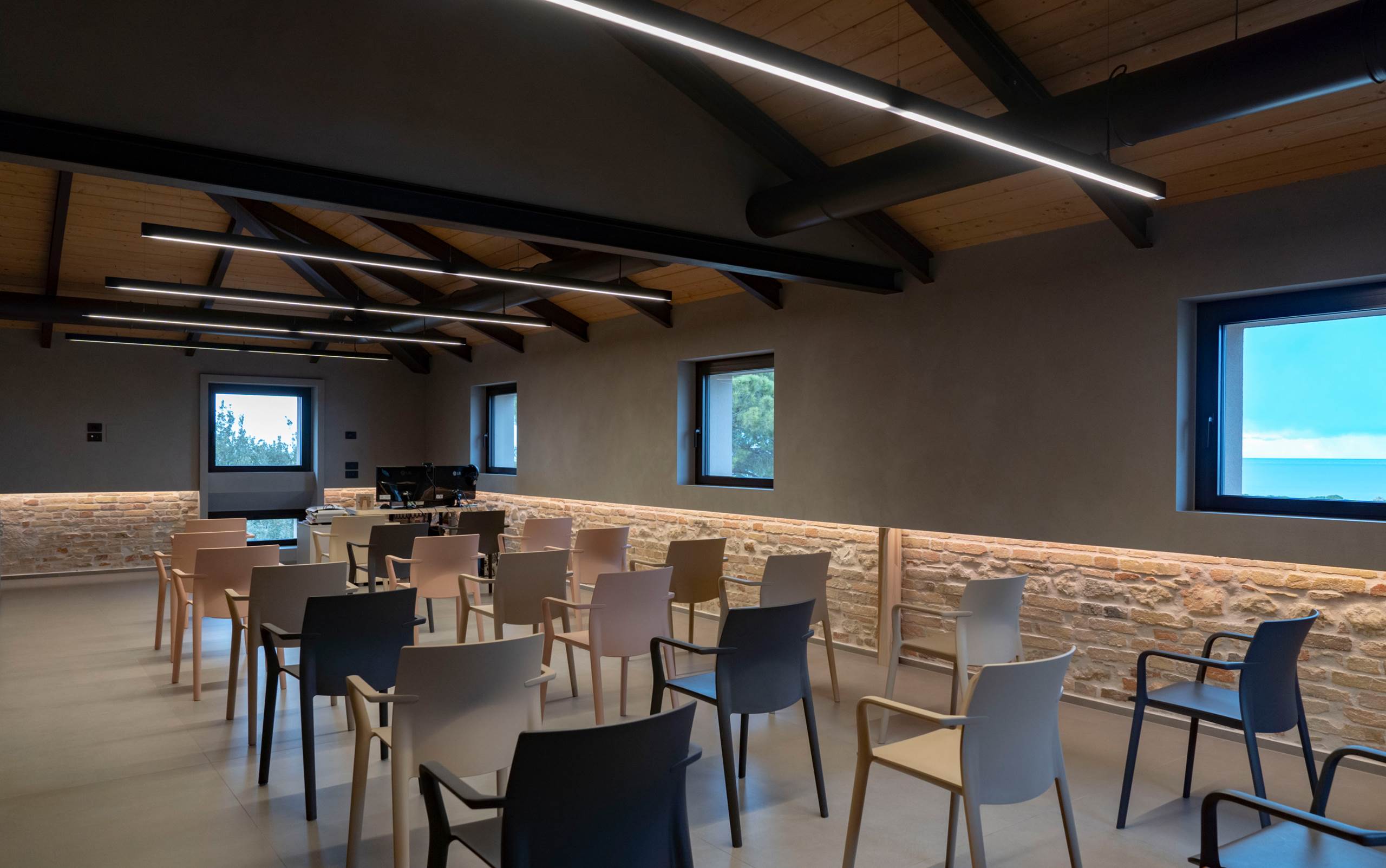 Gli spazi operativi interni sono stati realizzati allo scopo di ottenere la necessaria concentrazione mentre per gli ambienti comuni e di ristoro, si è scelto di dare priorità alle aperture verso l’esterno, alle trasparenze ed alla continuità con la natura circostante alimentando così il relax e la creatività.